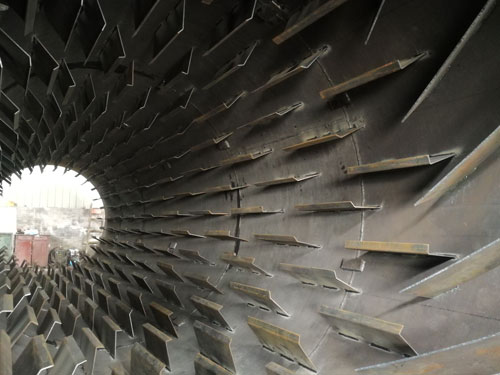 工人用鏟車(chē)或其他工具將成堆的干粉砂漿送至給料器中,給料器會(huì)均勻下料由輸送帶送至烘干機(jī)內(nèi),在進(jìn)料口處設(shè)計(jì)的有導(dǎo)流板,可將進(jìn)入的干粉砂漿往筒體內(nèi)部導(dǎo)流,避免物料進(jìn)入后都堆積在進(jìn)口處形成堵塞,進(jìn)入筒體的干粉砂漿在內(nèi)部隨著設(shè)備的轉(zhuǎn)動(dòng),被揚(yáng)料板帶起,到達(dá)頂部后落下,由于高溫氣流在筒體內(nèi)流動(dòng),對(duì)揚(yáng)起的物料形成干燥吹送的作用,將干粉砂漿干燥的同時(shí)吹送至烘干機(jī)尾部,此時(shí)物料已被烘干,而水汽也被抽出,烘干效果也達(dá)到要求。
